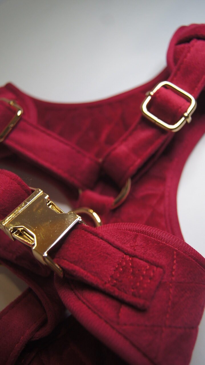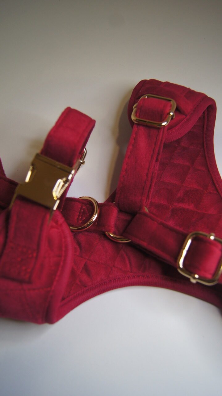 El arnés de la colección Velvet está confeccionado de un tejido de terciopelo combinando elegancia, comodidad y un toque lujoso que resalta la personalidad de nuestro perro. Su textura suave y agradable al tacto lo hace ideal para perritos con estilo y clase en cualquier ocasión. Es ajustable, accesorios de metal dorados y resistentes.